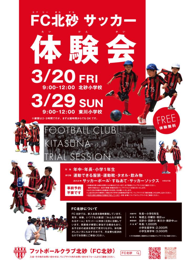 新メンバー募集中!春の体験会開催決定! FC北砂は東京都江東区で活動する小学生、未就学児のサッカークラブです。一緒にサッカーを楽しむメンバーを募集中です。 2026年度春の体験会開催決定!春からの習い事どうしようかな?サッカーってどんな感じかな?少しでも興味があればぜひ参加してみてください。まずは短時間からの参加もOKです! ※上記日程以外でも体験・見学可能です。無料体験ページからお申し込みください。※ご不明点はお気軽にお問い合わせください 最新情報はインスタでも発信中! fc.kitasuna 【6年生】さよなら合宿 28日1日と館山に合宿に行って参りました! 1日目現地で練習試合 北条FC 【1年&キンダー(新2、新1年)】 2/22、大島杯(1年生大会)へ参加させていただきました。 大 【5年】 2月22日 ESFORCOカップに参加しました。 リーグ戦 vs 江戸川ウイングスSC 【2年生(新3年)】2月23日(月祝) 辰巳グラウンドにてU8リーグが行われました。 Aグループ 【6年生】練習試合 本日は深川SCさんと11人制の練習試合を行いました。 《結果》 FC北砂 v 【1年&キンダー(新2、新1年)】 2/21、王一FCさんと練習試合を行いました! 6人制で計1 【4年(新5年)】 2/21,22に2日連続で練習試合を行いました。 新5年としてキャプテン、副キャ 【5年】 2月14〜15日 江東FCカップに参加しました。 2/14 リーグ戦 vs スターキッ 【6年生】練習試合 本日は江戸川ウイングスさんと練習試合を行いました! 《結果》 FC北砂 VS 【2年生】1月31日土曜日 第二大島中にて練習試合でした! 結果は… 5敗1引き分け 悔しすぎ 【4年】佃FCさん、南池袋FCさんと練習試合を行いました。 チャンスをしっかりと決めきり、守備も集中 【5・6年生】練習試合 本日は、桜川SCさんにお越し頂き練習試合を行いました 桜川SCさん遠方よ 【2年生】1月25日日曜日、FC城東さんと練習試合をさせていただきました! 天気は快晴! 冬らしい 【5年生】江東深川ライオンズクラブ招待大会 決勝トーナメント 2位パート 《試合結果》 ①VSバデ 【5年生】江東深川ライオンズクラブ招待大会 2026年最初の試合 気持ち新たに挑みました 《試合結 【6年生】練習試合五砂FCさん 本日は五砂FCさんと練習試合を行いました! 《結果》 FC北砂 【3年生_試合報告】未来チャレンジリーグ 順位決定トーナメント 2026年の幕開けとなる今大会。 【キンダー】 中野木FCさん主催のキッズ交流戦に参加させていただきました! ▼年中さん 年中メンバ 【地域清掃】 先日の日曜日は、お世話になっている地域のゴミ拾いをしました😊✨ ありがとう。 お疲 【2年生】1月11日(日)大島杯に参加しました。 1試合目 北砂0ー1● 2試合目 北砂0ー6● さらに読み込む Instagram でフォロー