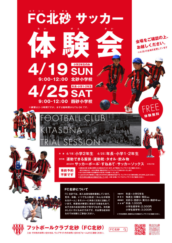 新メンバー募集中!春の体験会開催決定! FC北砂は東京都江東区で活動する小学生、未就学児のサッカークラブです。一緒にサッカーを楽しむメンバーを募集中です。 2026年度春の体験会開催決定!春からの習い事どうしようかな?サッカーってどんな感じかな?少しでも興味があればぜひ参加してみてください。まずは短時間からの参加もOKです! ※上記日程以外でも体験・見学可能です。無料体験ページからお申し込みください。※ご不明点はお気軽にお問い合わせください 最新情報はインスタでも発信中! fc.kitasuna 【5年】4/5練習試合 レインボーズさんに胸をお借りして、練習試合を行いました。おしゃべりおふざけ大 【6年】 4月5日 江東区チャンピオンズリーグ6年生大会 FC北砂は、大会日程4日目の本日から参 【4年】外出SCさんと練習試合を行いました。 結果は4勝1敗でした! 1試合目 北砂2-0外手 2 【6年生】区民大会 6年生として、初の公式戦 爽やかにスタート!!といきたいところでしたが、局地的に 【3年生】4月4日土曜日 豊海運動公園にて月島カップが開催されました! 予選リーグ 1試合目 ●0 【'26 春の体験会開催!】 毎年多くのお子さまに参加いただいているFC北砂サッカー体験会。4月も開 3/15に、最高学年としてチームを引っ張ってくれた6年生が、卒団の日を迎えました🌸 「最強学年の次 【新6年生】 3月22日(日)東京の🌸桜も開花し春の陽射しを浴びながら… 青空と東京タワーの朱と白が 【6年生】サヨナラ大会2日目 《結果》 FC北砂 VS FC城東 4 - 1 FC北砂 V 【4年(新5年)】 本日は練習試合を行いました。 綺麗な人工芝のグラウンドに興奮して朝から元気な子ど 【1年生(新2年)】 ⚽️ FC北砂1年生、練習中! ⚽️ 今日の練習風景です✨ みんな一生懸命 【1年・キンダー(新2、1年)】 3/8はワイズカップに参加しました。 朝から夕方までの経験は初め 【1年・キンダー(新2、1年)】 2/7、23は豊洲カップに参加しました。 初日は雪が降り、気温が 【2年生(新3年生)】3月8日(日)大島小松川公園サッカー場にて 佃FCさんとの練習試合をさせてい 【6年生】サヨナラ大会 さぁ、6年生も最後の大会となりました😢✨ 皆様、早朝からサポートありがとう 【'26 春の体験会開催!】 毎年多くのお子さまに参加いただいているFC北砂サッカー体験会。今年も開 【6年生】さよなら合宿 28日1日と館山に合宿に行って参りました! 1日目現地で練習試合 北条FC 【1年&キンダー(新2、新1年)】 2/22、大島杯(1年生大会)へ参加させていただきました。 大 【5年】 2月22日 ESFORCOカップに参加しました。 リーグ戦 vs 江戸川ウイングスSC 【2年生(新3年)】2月23日(月祝) 辰巳グラウンドにてU8リーグが行われました。 Aグループ さらに読み込む Instagram でフォロー